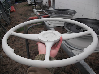 I feel like i've taken way too long on these wheels, but they were in pretty rough shape. They are looking very good now. I have them both in primer and ready for paint, but haven't taken a picture yet. But I will tomorrow morning before the paint goes on. Doug decided that both wheels were going to be painted white. A boring color but an original one. Steering wheels are what the driver look at most, since they're behind it, so I feel like they have to look perfect. Tom is probably getting frustrated with my perfectionism but he is still proud of me and I do other odd jobs in the shop.
